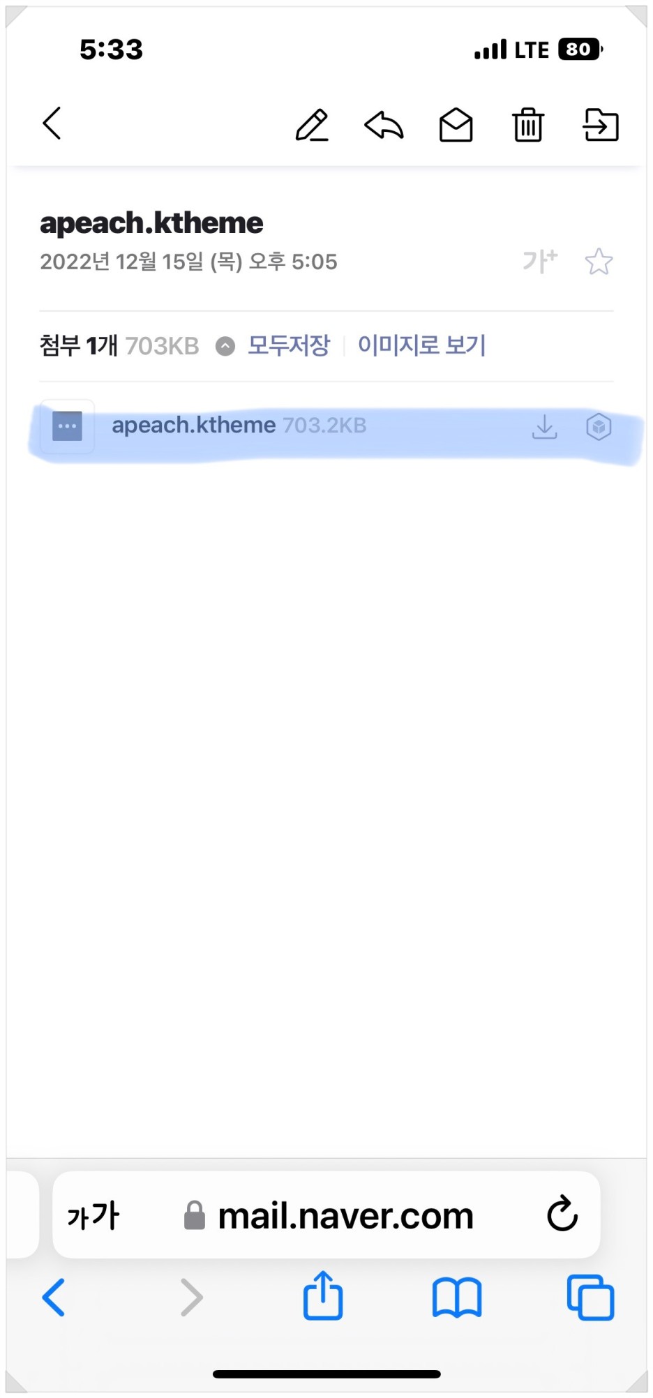 카카오톡 테마 파일은 ooo.ktheme 확장자명을 가지고 있습니다. 무료로 배포하는 곳에서 자료를 다운로드해서 제 카카오톡에 적용하는 방법입니다. 우선 저는 제 메일에 보내서 적용해 보았습니다.